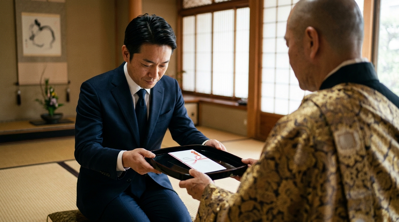 お布施を僧侶にお渡しする際には、いくつかの重要なマナーがあります。まず、お布施は袱紗(ふくさ)に包んで持参するのがマナーです。袱紗とは金品を包むための四角い布のことで、弔事の場合は紺色、深緑色、灰色などの寒色系のものを使用します。紫色の袱紗は慶事・弔事の両方に使えるため、一枚持っておくと便利です。