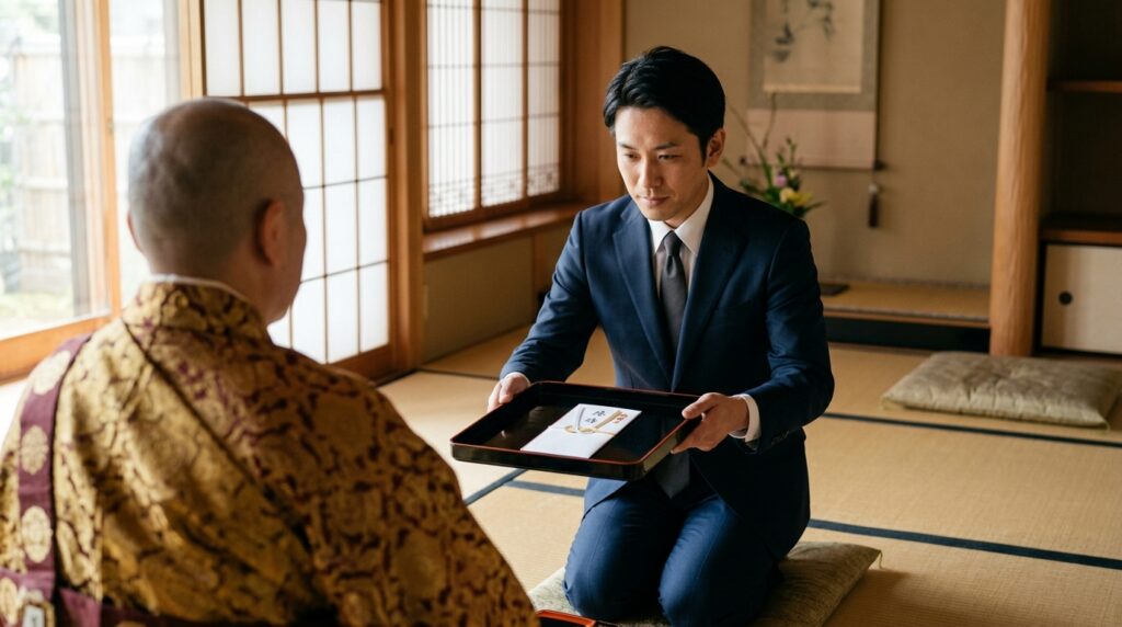 僧侶にお渡しする際は、袱紗からお布施を取り出し、袱紗の上に乗せた状態で差し出します。あるいは、切手盆(きってぼん)と呼ばれる黒塗りの小さなお盆の上に載せてお渡しする方法もあります。正式な作法では切手盆を使用します。